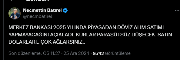Ekonomist Necmettin Batırel, dolar kurunun düşceeğini açıkladı. Batırel yaptığı açıklamada, "Merkez Bankası 2025 yılında piyasadan döviz alım satımı yapmayacağını açıkladı. Kurlar paraşütsüz düşecek. Satın dolarları çok ağlarsınız" dedi.