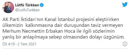 Sosyal medyada gelen tepkiler üzerine Lütfü Türkkan bir açıklama daha yaptı ve "AK Parti İktidarı'nın Kanal İstanbul projesini eleştirirken ülkemizin kalkınmasına dair duruşundan taviz vermeyen Merhum Necmettin Erbakan Hoca ile ilgili sözlerimin yanlış bir anlaşılmaya sebep olmasından dolayı üzgünüm" dedi.