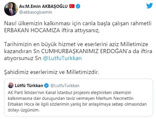 AK Parti Grup Başkanvekili M. Emin Akbaşoğlu, Twitter hesabı üzerinden Lütfü Türkkan'a şu sözlerle yanıt verdi: