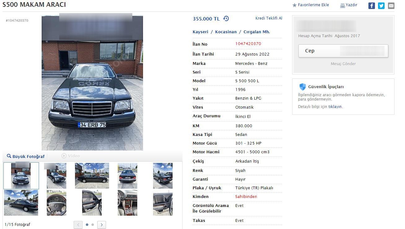 355 bin liraya satılan Mercedes S500 L marka ve modeldeki aracın 380 bin kilometrede olduğu görüldü.