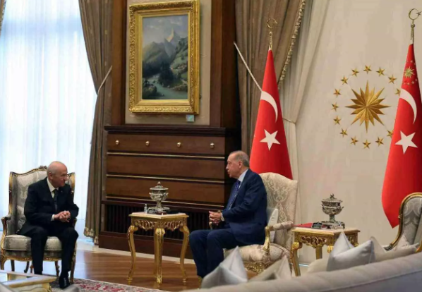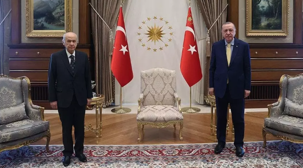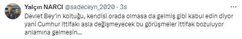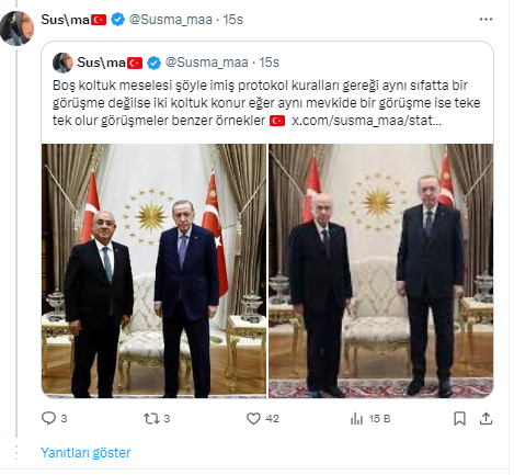 Bu aslında bir standart bir oturma düzeni. Sayın Bahçeli'nin de Sayın Cumhurbaşkanı ile Külliye'de yaptığı görüşmelerde de aslında orada bir sandalye daha var. Ama orada ikili görüşme planı ön plana çıkar. Dolayısıyla o bir oturma düzenini ifade ediyor. Standart bir oturma düzeni aslında."