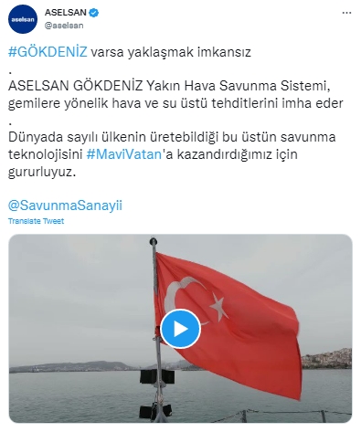 "GÖKDENİZ varsa yaklaşmak imkansız. ASELSAN GÖKDENİZ Yakın Hava Savunma Sistemi, gemilere yönelik hava ve su üstü tehditlerini imha eder. Dünyada sayılı ülkenin üretebildiği bu üstün savunma teknolojisini #MaviVatan'a kazandırdığımız için gururluyuz."
