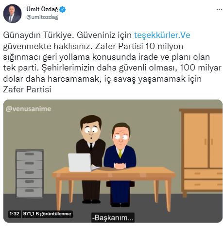 "Günaydın Türkiye. Güveniniz için teşekkürler ve güvenmekte haklısınız. Zafer Partisi 10 milyon sığınmacı geri yollama konusunda irade ve planı olan tek parti. Şehirlerimizin daha güvenli olması, 100 milyar dolar daha harcamamak, iç savaş yaşamamak için Zafer Partisi"