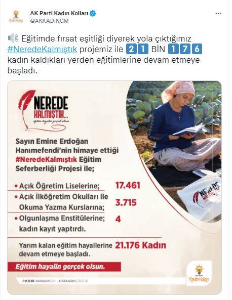 AK Parti Genel Merkez Kadın Kolları Başkanlığı resmi sosyal medya hesabından yapılan paylaşımda “Nerede Kalmıştık” adlı eğitim seferberliğinin verilerine ver verildi.