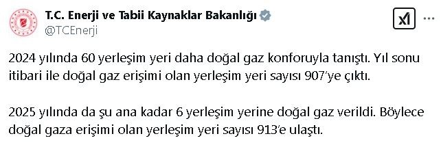 Bakanlıktan yapılan açıklamaya göre; 2024 yılında 60 yerleşim yerine daha doğal gaz iletildi. Yıl sonu itibarıyla doğal gaz bağlantısı sağlanan yerleşim yeri sayısı 907'ye çıktı. 2025 yılında da şu ana kadar 6 yerleşim yerine doğal gaz verildi. Böylece doğal gaza erişimi olan yerleşim yeri sayısı, 913'e ulaştı. 2025 yılı sonuna kadar toplam 96, 2026 yılında da 44 yerleşim yerine daha doğal gaz ulaştırılması hedefleniyor. Böylece 2026 sonu itibarıyla 1053 yerleşim yerinde doğal gaz kullanılacak.