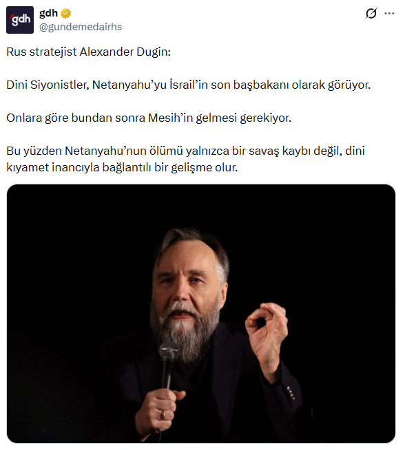 Dugin’e göre; dini Siyonistler Netanyahu’yu İsrail’in son başbakanı olarak görüyor. Bu ölümün sadece askeri bir kayıp değil, dini bir kıyamet inancının başlangıcı olduğunu belirten Dugin, Siyonistlerin artık "Mesih" beklentisine girdiğini ifade etti.