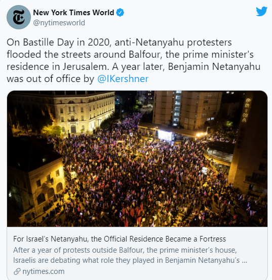 Koltuğunu kaybeden Benyamin Netanyahu boşaltması gereken başbakanlık konutunda ABD'nin eski BM Temsilcisi Haley'i ağırladı. Bu haber sonrası İsrail'in görevdeyken yolsuzluktan yargılanan ilk başbakanına yönelik protestoların başını çeken 'Suç Başbakanı' grubu, Netanyahu'ya 27 Haziran tarihini vererek rest çekti.