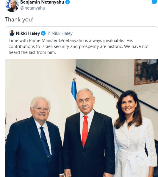Üstüne üstlük Haley, Netanyahu'ya başbakan diye hitap ettiği tweet atıp "Başbakan Netanyahu ile vakit geçirmeye her daim değer biçilemez. Onun İsrail güvenliği ve refahına katkıları tarihi boyuttadır. Daha son sözünü söylemedi" dedi.