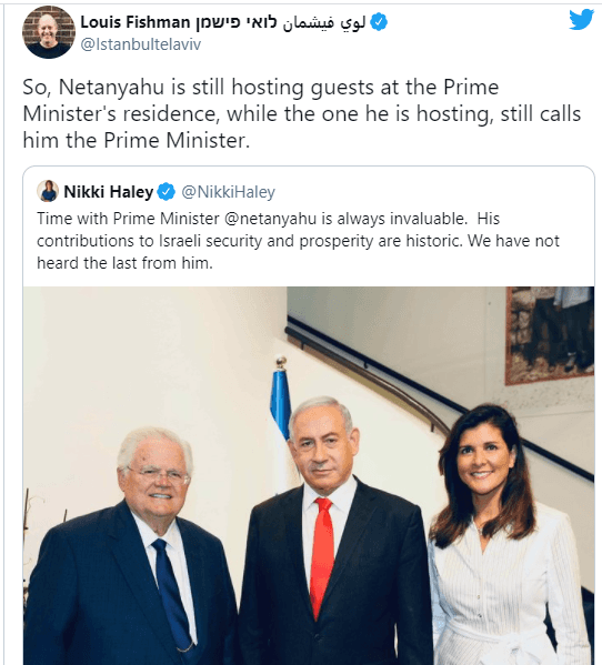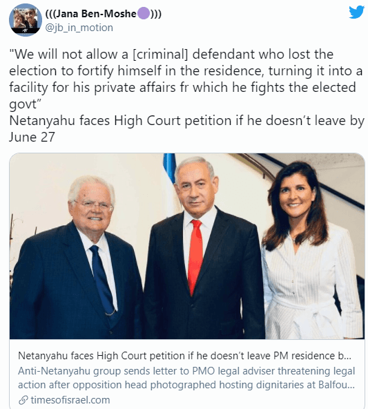 Netanyahu, başbakanlık konutunu terk etmek bir yana ABD'nin eski BM Temsilcisi Nikki Haley ile İsrail İçin Birleşmiş Hıristiyanlar (CUFI) Başkanı John Hagee'yi burada ağırlamasının görüntülerini paylaştı. Fotoğraf, muhalefet başkanının neden başbakanlık konutunu yabancı devlet yetkililerini ağırlamak için kullanmaya devam ettiği sorusu eşliğinde büyük tepkiye yol açtı.