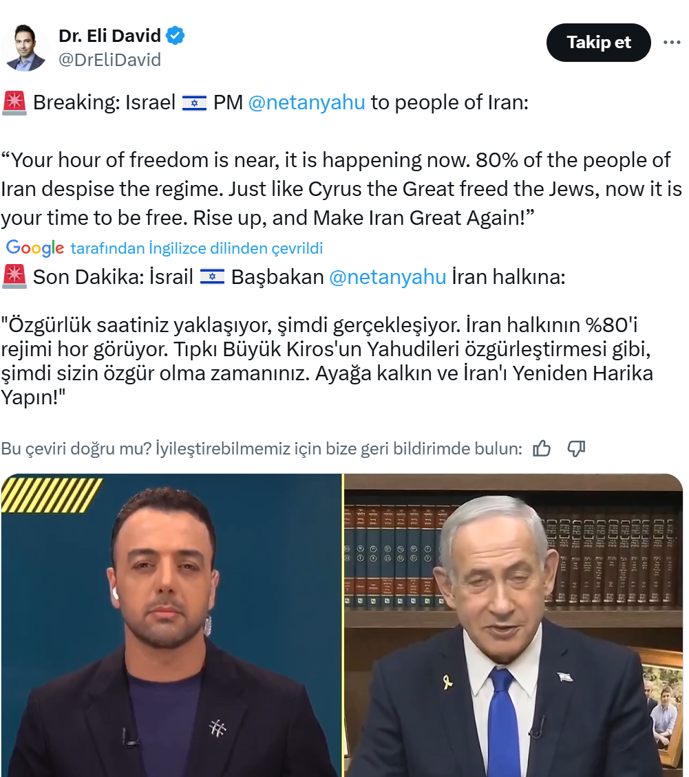İsrail Başbakanı katil Binyamin Netanyahu, İran’daki muhalif bir televizyon kanalından yaptığı skandal yayında, İran halkına doğrudan seslendi. "Özgürlük saatiniz yaklaşıyor, şimdi gerçekleşiyor. İran halkının %80'i rejimi hor görüyor. Tıpkı Büyük Kiros'un Yahudileri özgürleştirmesi gibi, şimdi sizin özgür olma zamanınız. Ayağa kalkın ve İran'ı yeniden harika yapın!" ifadeleriyle adeta iç karışıklık çağrısı yaptı.