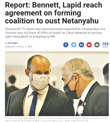 İsrail’de son iki yılda 4 defa seçim yapılmasına rağmen hükümetin kurulamadğı İsrail’de Yari Lapid’in Yesh Atid partisi ile Naftali Bennett’in Yamina partisi hükümeti kurma konusunda uzlaştı. Netanyahu’yu 11 yıl sonra koltuğundan indirecek olan koalisyonda Bennett’in 2023’e kadar; Lapid’in de sonrasındaki 2 yılda başbakan olacağı belirtildi.