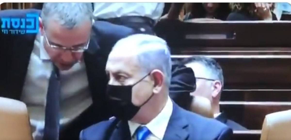 İsrail'de koalisyon hükümetinin güvenoyu almasının ardından Netenyahu, Knesset'te oturduğu koltuktan kalkması için uyarı aldı. Netenayhu'nun tüm dünyaya rezil olduğu anlar sosyal medyada dalga konusu oldu.