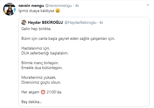 Twitter’da Diyanet İşleri Başkanlığı’nda Başkanlık Müşavirliği yapan Haydar Bekiroğlu’nun, ‘Hastalarımız için, dua seferberliği başlatalım’ çağrısına Nevşün Mengü, ‘İşimiz duaya kaldıysa’ diye karşılık verdi.
