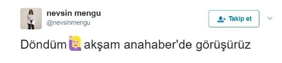 Görevine yeniden başlama ümidiyle tatilden dönen Mengü, ekrana çıkarılmayınca "Akşama görüşürüz" tweet'ini silmek zorunda kalmıştı.