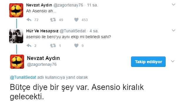 Nevzat Aydın, sosyal medya hesabında Asensio’nun golü sonrası, "Ah Asensio ah" şeklinde yaptığı paylaşıma bir taraftarın, "Asensio ile Bero’yu aynı ekip mi belirledi?" sorusu üzerine, "Bütçe diye bir şey var. Asensio kiralık gelecekti" yanıtını verdi.