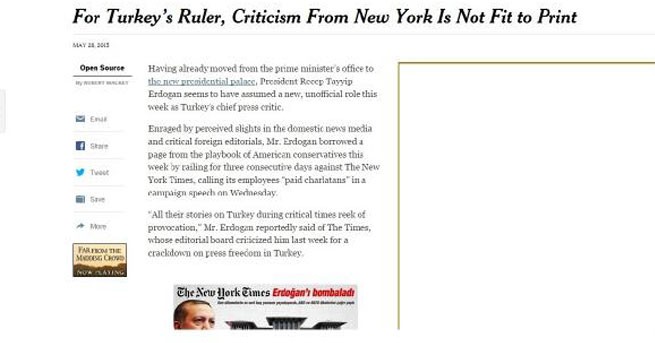 Gazete "Türk Cumhurbaşkanı’na göre New York’tan eleştiri basıma uygun değil’’ başlıklı yazısında, "Başbakanlık ofisinden yeni Cumhurbaşkanlığı Sarayı’na taşınan Cumhurbaşkanı Recep Tayyip Erdoğan, bu hafta da yeni ve resmi olmayan bir rol üstlenmiş gibi görünüyor: Türkiye'nin baş basın eleştirmeni’’ diye yazarak Türkiye Cumhurbaşkanı'na ağza alınmayacak ifadelerde bulundu.