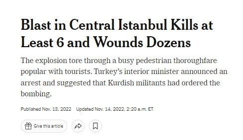 Terör saldırısını ve saldırının kurbanı olan masum sivilleri adeta görmezden gelen NYT, sosyal medya hesabından bir paylaşımda daha bulunarak, "Pazar günkü patlama, önceki yıllarda şehirlerini vuran ölümcül saldırılardan uzaklaşıyor gibi görünen Türkiye için beş yıllık nispeten sakin bir dönemi paramparça etti" söylemlerinde bulunmuştu.