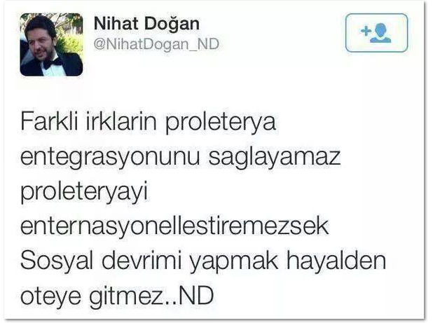 Twitter'dan yaptığı paylaşımlar ile birçok kez ne dediği anlaşılamayan ve komik durumlara düşen Nihat Doğan, aynı senaryoyu bir kez daha tekrarla. Doğan, tweetinde 'Farklı ırkların proteleterya entegrasyonunu sağlayamaz proteletayı enternasyonelleştiremezsek sosyal devrimi yapmak hayaleden öteye gitmez' ifelerinde kullanarak tweet'i i okuyanları güldürdü.