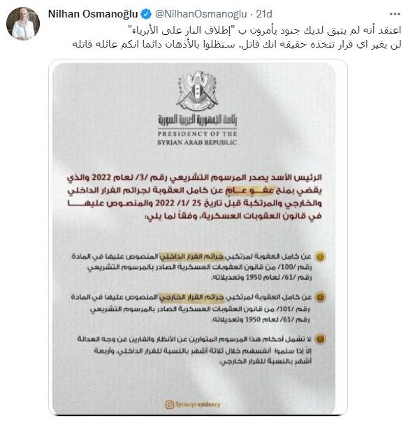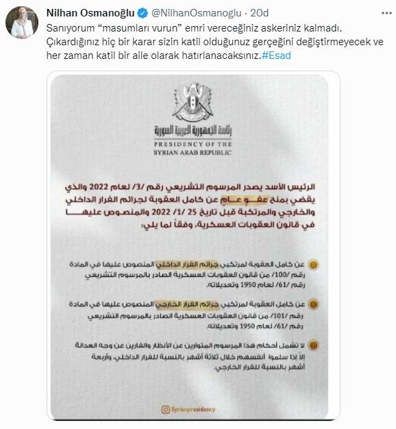 Suriye’de yaşanan iç savaş nedeniyle ülkeyi terk edenleri af ettiğini söyleyen bebek katili Esed’a, Sultan Abdulhamid’in torunu Nilhan Osmanoğlu’ndan tepki geldi. Osmanoğlu sosyal medya hesabı üzerinden hem Arapça hem de Türkçe olarak yaptığı paylaşımda, “Sanıyorum “masumları vurun” emri vereceğiniz askeriniz kalmadı. Çıkardığınız hiç bir karar sizin katil olduğunuz gerçeğini değiştirmeyecek ve her zaman katil bir aile olarak hatırlanacaksınız #Esad” ifadelerini kullandı.
