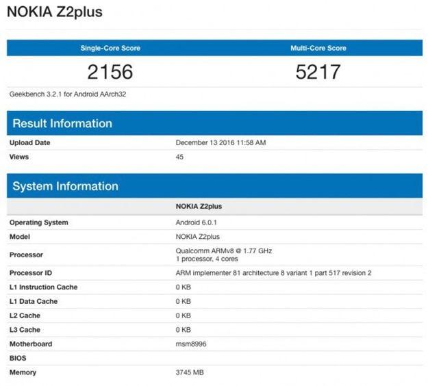 Nokia Z2 Plus’ın Geekbench testine göre telefon, Snapdragon 820 işlemci ve 4GB RAM ile güçlendirilmiş. Nokia Z2 Plus bu testte tek çekirdeklide 2156, çok çekirdeklide 5217 puan almış.