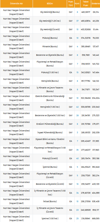 Nuh Naci Yazgan Üniversitesi taban puanları 2021, yüzdelik dilimleri ve kontenjan sayıları kaçtır?
