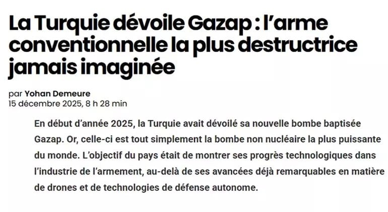 Fransız basınından Science Post, Türkiye’nin en yüksek tahrip gücüne sahip konvansiyonel uçak bombası GAZAP’ı mercek altına alırken, “bugüne kadar tasarlanmış en güçlü nükleer olmayan silah” olarak tanımladı.