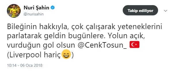 Futbol hayatını Borussia Dortmund'da sürdüren eski milli futbolcu Nuri Şahin, "Bileğinin hakkıyla, çok çalışarak yeteneklerini parlatarak geldin bugünlere. Yolun açık, vurduğun gol olsun @CenkTosun_(Liverpool hariç)" şeklinde esprili mesaj attı.