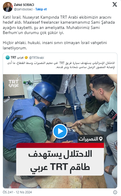 İsrail ordusunun Gazze Şeridi'ndeki Nusayrat Mülteci Kampı'nı bombalaması sonucu aralarında TRT Arapça ekibinin de bulunduğu bir grup gazeteci yaralandı.