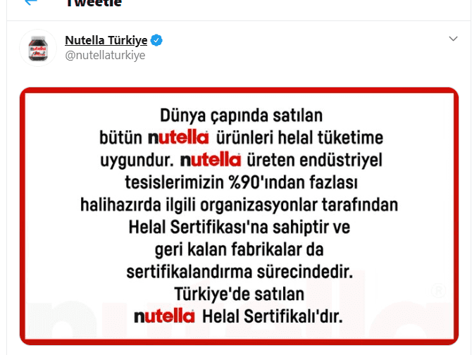 Firmanın helal sertifikasına sahip olduğunu bildiren Nutella, ‘Daha önceki twitimiz hatalıydı ve bundan dolayı özür dileriz’ açıklamasını yaptı.