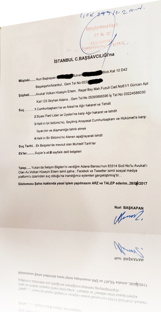 verilen suç duyurusu dilekçesinde, “Adana Barosu’nun 83314 sicil no’lu avukatı olan Volkan Hüseyin Ertem isimli şahıs; Facebook ve Twitter isimli sosyal medya platformu üzerinden suç olduğuna inandığımız eylemleri gerçekleştir. Sözkonusu şahıs hakkında yasal işlem yapılmasını arz ve talep ederim.” ifadelerine yer verildi.