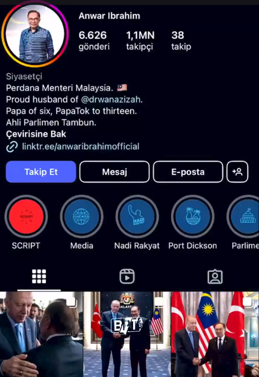 Malezya Cumhurbaşkanı Enver İbrahim, Türkiye Cumhurbaşkanı Recep Tayyip Erdoğan ile gerçekleştirdiği resmi görüşmenin ardından sosyal medya hesabından bir fotoğraf paylaştı. İbrahim, paylaştığı bu fotoğrafın altına ünlü şarkıcı İrem Derici'nin "Kalbimin Tek Sahibine" adlı şarkısını ekledi.