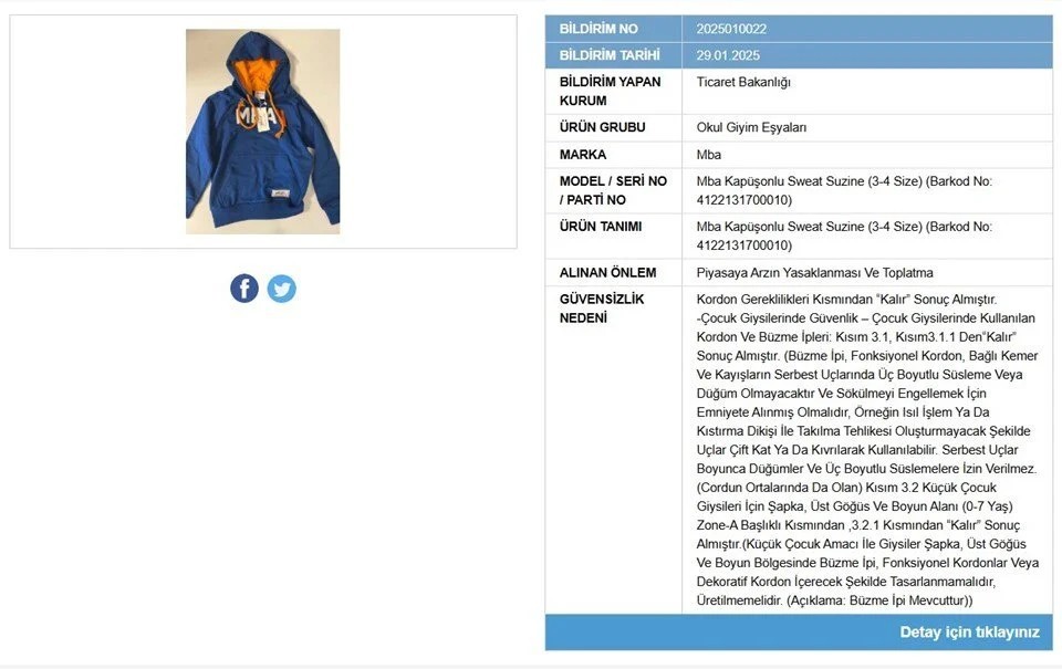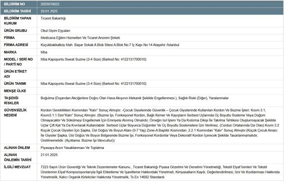 Bakanlık, okul giyim eşyaları arasında yer alan ve "Mba" markasının piyasaya sürülen kapüşonlu sweat için piyasaya arz ve toplatma kararı aldı.