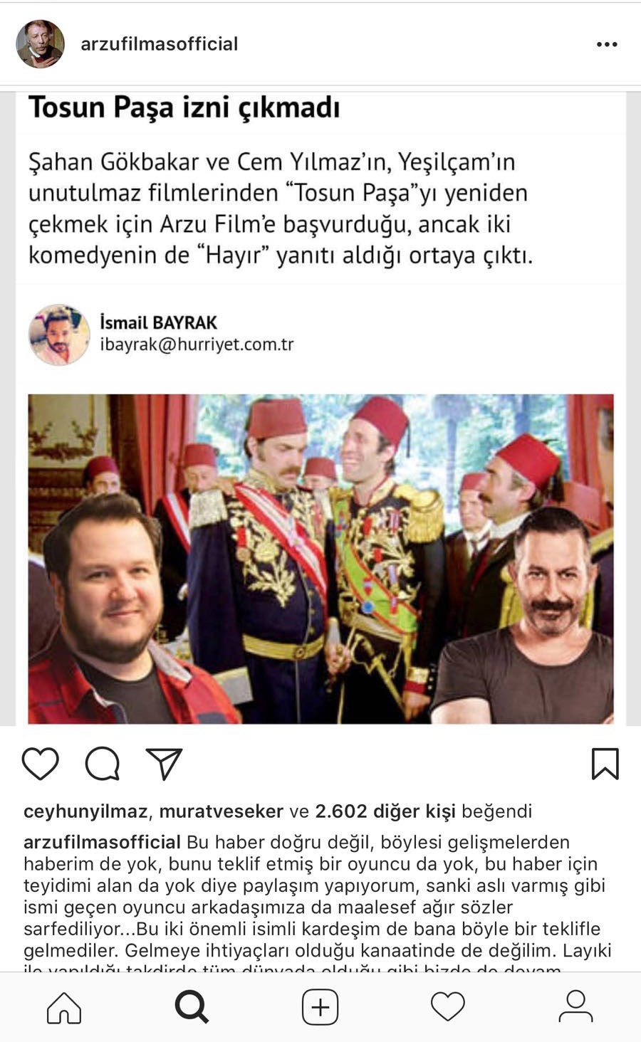 Dün internette yayılan Cem Yılmaz'ın ve Şahan Gökbakar'ın 'Tosun Paşa' filmini yeniden çekme isteklerinin Arzu Film tarafından reddedildiği haberlerine Arzu Film'in resmi Instagram hesabından yalanlama geldi.