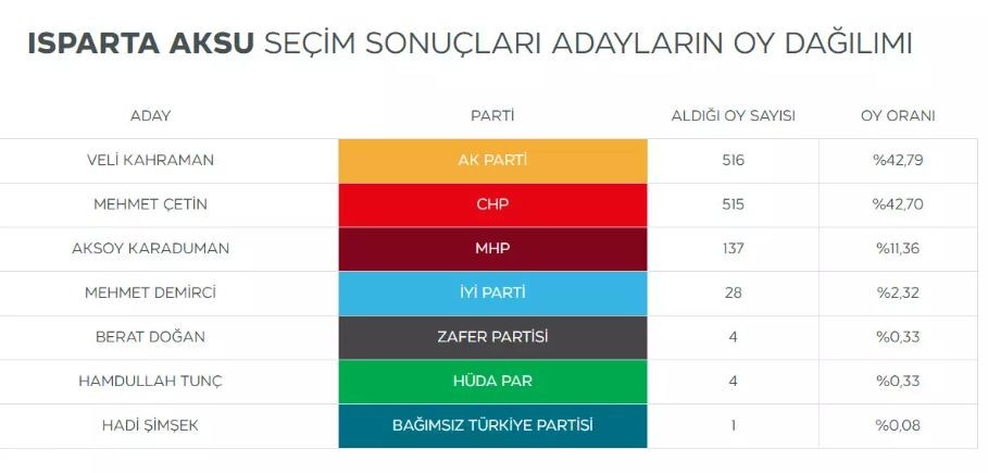 Isparta'nın Aksu ilçesinde AK Parti'nin adayı Veli Kahraman bir oy farkla seçimi kazandı.