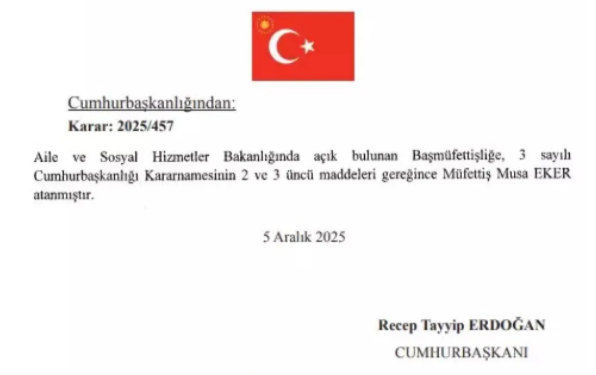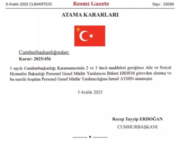 Aile ve Sosyal Hizmetler Bakanlığı Personel Genel Müdür Yardımcısı Bülent Erdem görevden alındı. Bu suretle boşalan Personel Genel Müdür Yardımcılığı'na İsmail Aydın atandı. Aile ve Sosyal Hizmetler Bakanlığı'nda açık bulunan Başmüfettişliğe ise Müfettiş Musa Eker atandı.