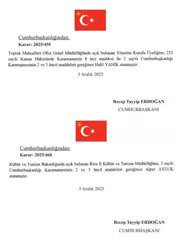 Kültür ve Turizm Bakanlığında açık bulunan Rize İl Kültür ve Turizm Müdürlüğü'ne Alper Avluk atanırken, Milli Eğitim Bakanlığı Ortaöğretim Genel Müdür Yardımcısı Hatice Özdemir, Devlet Su İşleri Genel Müdürlüğü 6’ncı Bölge Müdürü Celal Tokalak, 9’uncu Bölge Müdürü Sebahattin Şamcı görevden alındı.