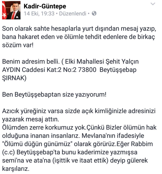 PKK'nın suikast hazırladığı iddia edilen Beytüşşebap Kaymakamı Kadir Güntepe terör örgütüne meydan okudu. Güntepe Facebook hesabından "Azıcık yüreğiniz varsa siz de açık kimliğinizle adresinizi yazarak mesaj atın" diye yazdı.