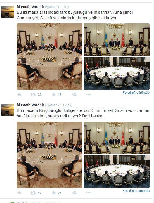 Varank, "Bu iki masa arasındaki fark büyüklüğü ve misafirler. Ama şimdi Cumhuriyet, Sözcü yalanlarla kudurmuş gibi saldırıyor. Bu masada Kılıçdaroğlu,Bahçeli de var. Cumhuriyet, Sözcü vs o zaman bu iftiraları atmıyordu şimdi atıyor? Dert başka." tweetlerini paylaştı.