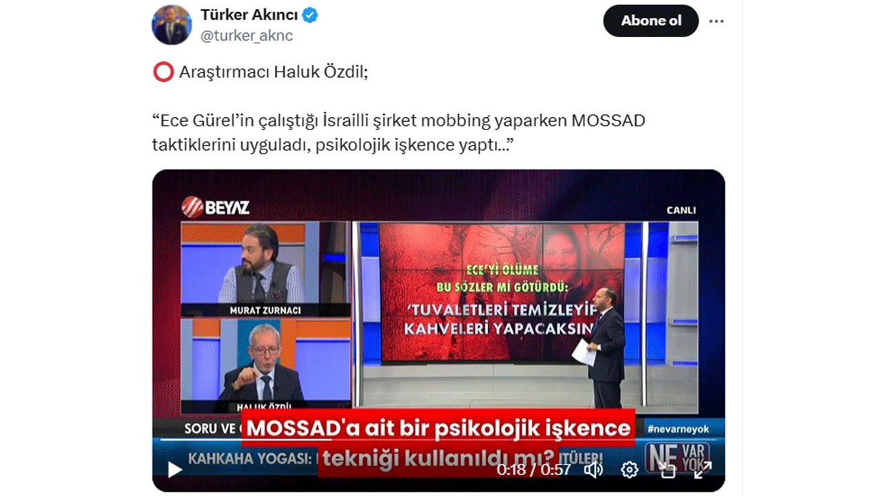 Ece Gürel'in çalıştığı "BatıLaw" isimli avukatlık ofisinin "Siyonist İsrail devletinin resmi hukuk bürosu" gibi çalıştığını öne süren Araştırmacı-Yazar Haluk Özdil, katıldığı bir televizyon programında, "Ece Gürel’in çalıştığı İsrailli şirket mobbing yaparken MOSSAD'a ait bir psikolojik işkence tekniği kullanıldı mı?" diye sordu.