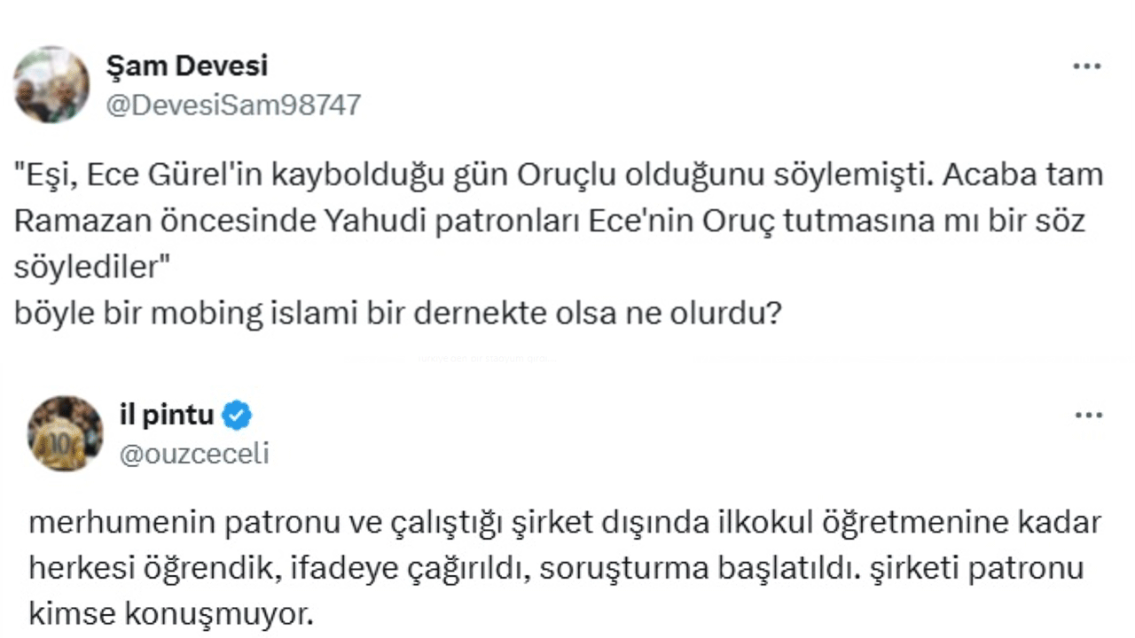 "Eşi, Ece Gürel'in kaybolduğu gün Oruçlu olduğunu söylemişti. Acaba tam Ramazan öncesinde Yahudi patronları Ece'nin Oruç tutmasına mı bir söz söylediler. böyle bir mobing islami bir dernekte olsa ne olurdu?"