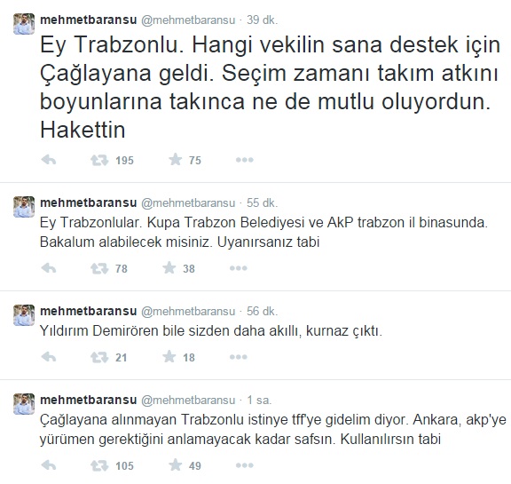 Yaşanan olaylar üzerine paralel yapılanmanın medya organında kalem oynatan Mehmet Baransu, Twitter hesabından yaptığı kışkırtmalarla Trabzonspor taraftarı üzerinden provokasyon yapmaya başladı.