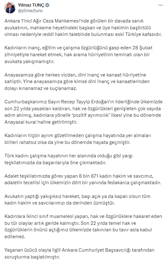 Adalet Bakanı Yılmaz Tunç, Ankara'daki bir duruşmada mahkeme heyetindeki başkan ve üye hakimin başörtülü olması nedeniyle reddi hakim talebinde bulunan avukat hakkında soruşturma başlatıldığını bildirdi.