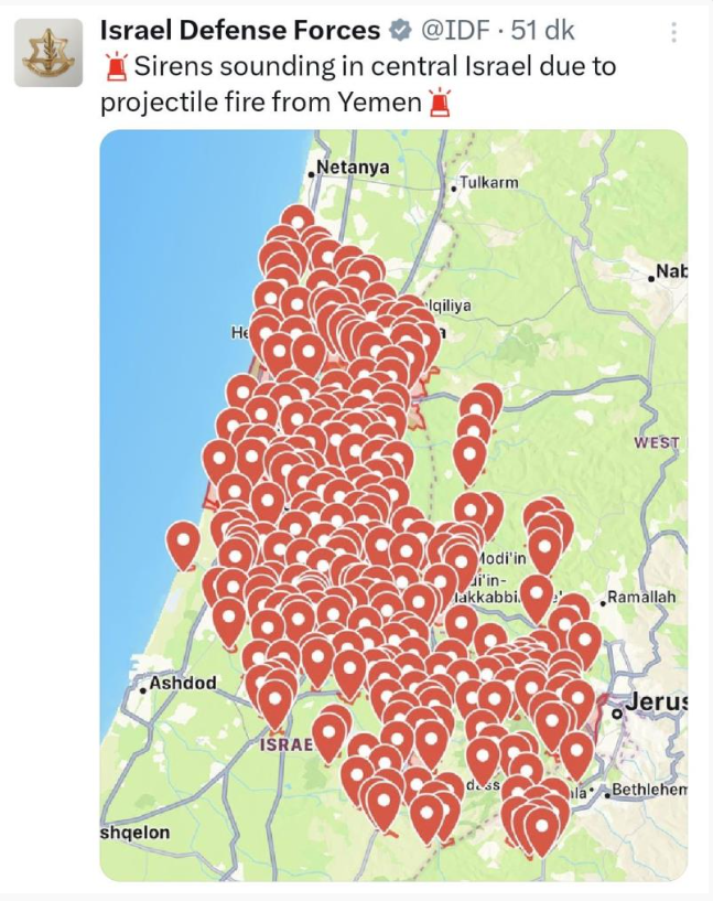 Gazze Şeridi'ni hedef alan saldırılarına yeniden hız kazandıran İsrail’e Yemen'den misilleme geldi. İsrail Savunma Kuvvetleri’nden (IDF) yapılan açıklamada, Yemen'den fırlatılan bir füze nedeniyle ülkenin merkez bölgelerinde sirenlerin çaldığı ve halka sığınaklara gitme çağrısı yapıldığı bildirildi.