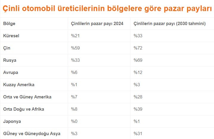ABD tarafında yakın zamanda koyulan yeni gümrük vergileri Çİnli üreticilerin ABD pazarında büyümesini sınırlayacak olsa da, Avrupa pazarında Çinlilerin pazar payını ikiye katlayarak %12'ye ulaşması bekleniyor. Rusya'da ise Çinliler %33'den %69'a çıkarak pazarı ele geçirecekler. Çinli üreticilerin satışlarının Orta Doğu ve Afrika'da %8'den %39'a, Orta ve Güney Amerika'da ise %7'den %28'e çıkması bekleniyor.