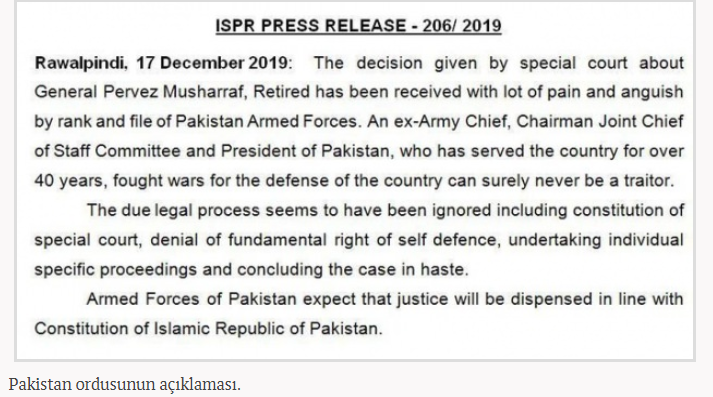 Pakistan eski Cumhurbaşkanı Pervez Müşerref'in idam cezasına çarptırılması sonrasında Pakistan ordusu muhtıra gibi bire mesaj yayımladı.