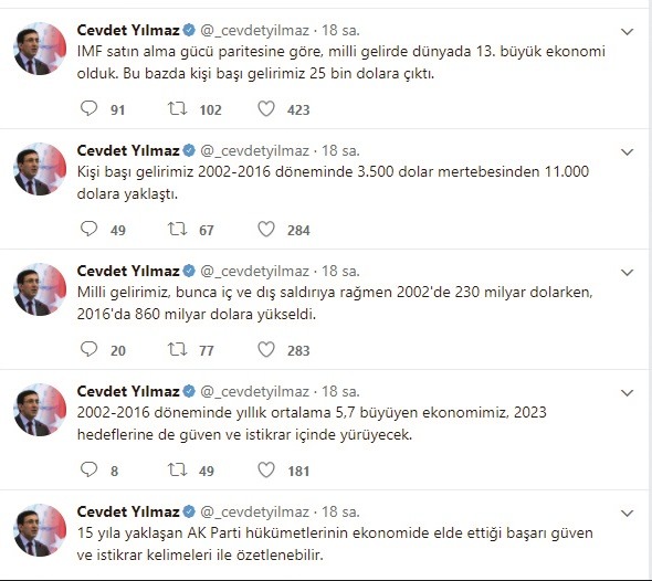 Cevdet Yılmaz da sosyal medya hesabındaki açıklamasında bu noktaya dikkat çekerek, “16 Nisan sonrası siyasi istikrarı kurumsal güvenceye kavuşturmuş bir ülke olarak, 2023 hedeflerine emin adımlarla yürüyeceğiz. 15 yıla yaklaşan AK Parti hükümetlerinin ekonomide elde ettiği başarı güven ve istikrar kelimeleri ile özetlenebilir” bilgisini paylaştı.