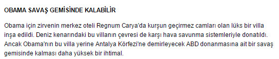 Obama'nın aylardır saklanan kalacağı kral dairesinin fotoğafları dün yayınlanmıştı. ABD Başkanı'nın kaldığı otelin fotoğrafları düşer düşmez akla birkaç gün önce Cumhuriyet'in yaptığı haber geldi. Cumhuriyet gazetesi, Türkiye'yi her fırsatta dünyaya "Güvenli ülke değil" şeklinde yansıtırken bu kez haber ellerinde patladı. Cumhuriyet yaptığı haberde Obama'nın savaş gemisinde kalacağını, Türkiye'de terör tehlikesi olduğundan dolayı güvenliğin sınırlı olacağını düşündüğünü yazmıştı.