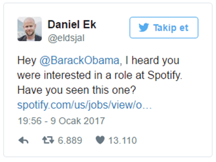 Spotify CEO'su Daniel Ek de Twitter'dan Obama'yı mention'layarak “Spotify'daki bir pozisyon ile ilgilendiğiniz duydum. Bunu gördünüz mü?” paylaşımıyla iş ilanını yolladı. İş ilanındaki aranan özellik arasında en az 8 yıllık ülke yönetim deneyimi, Nobel ödülü, tüm zamanların en iyi konuşmacısı gibi Obama'yı niteleyen şartlar bulunuyor.