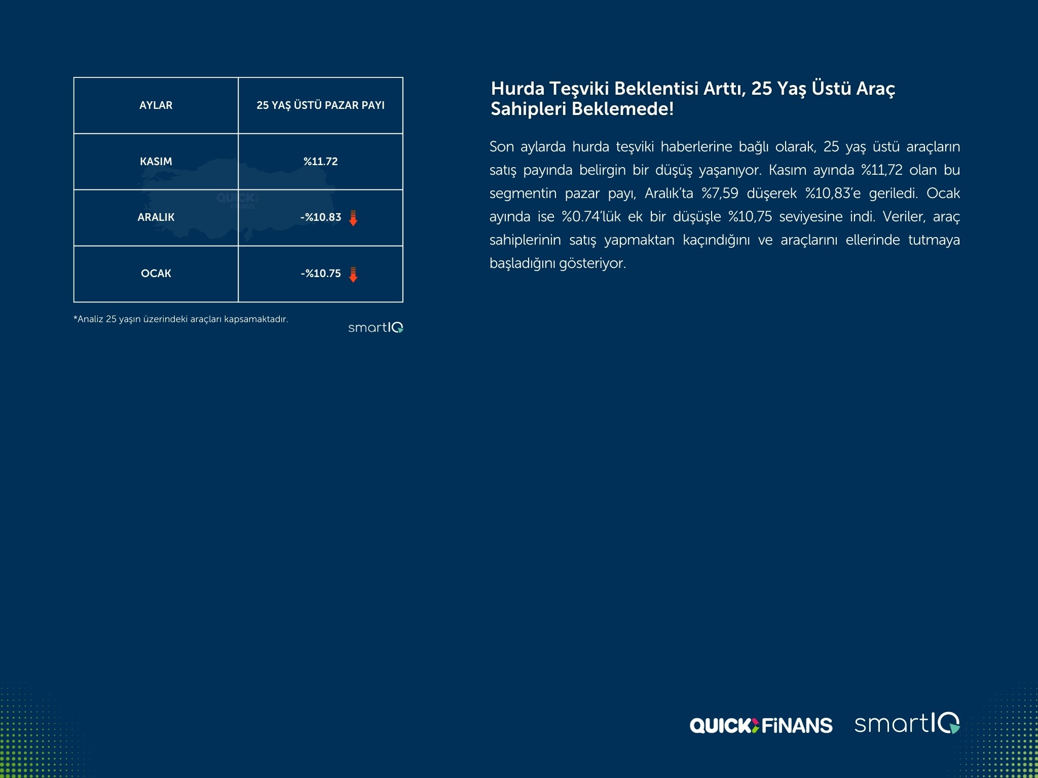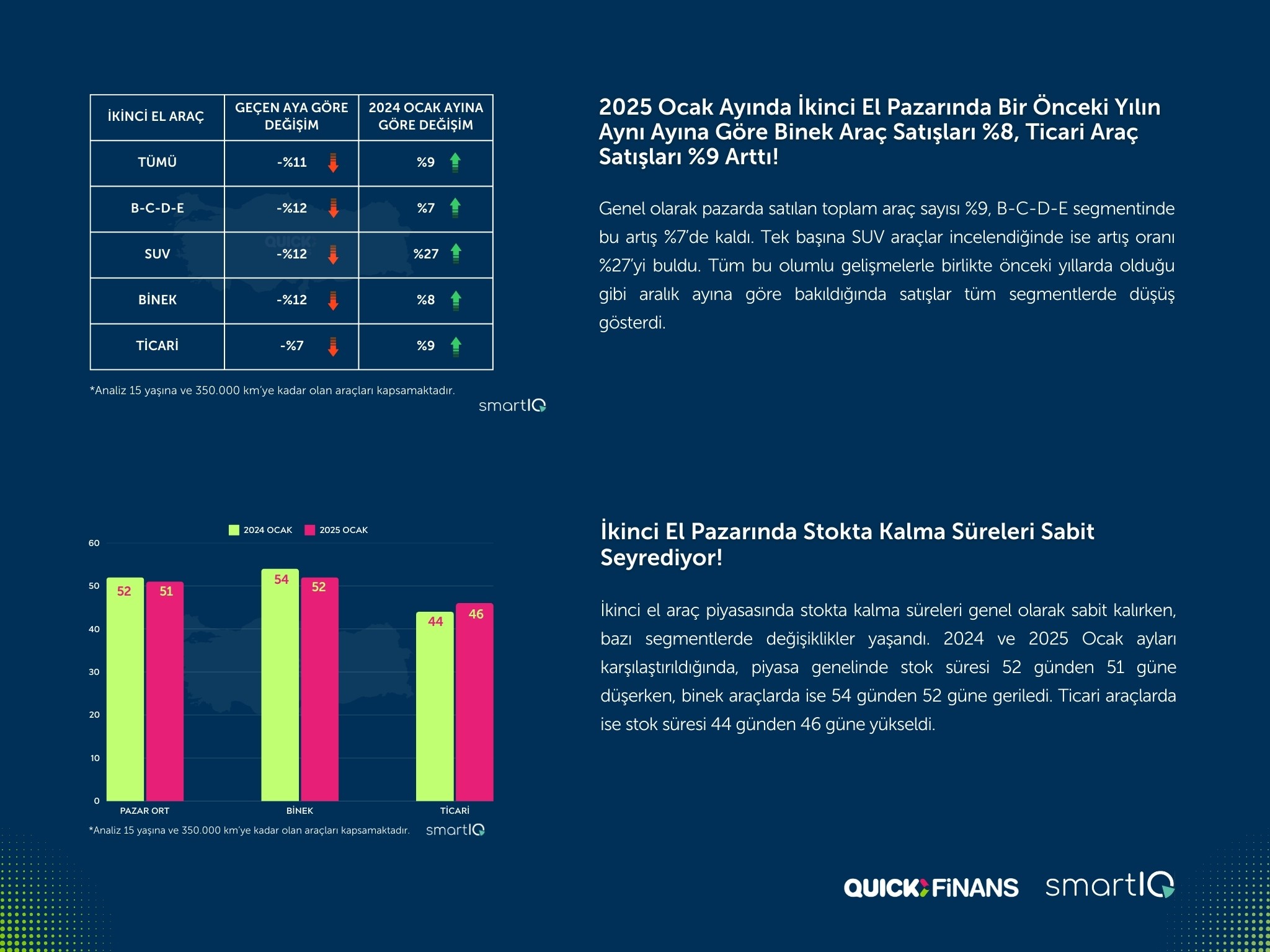 Uyarı: Bültende verilen bilgiler ve yorumlar, SmartIQ tarafından geçmiş dönem verilerden ve piyasa araştırması sonuçlarından faydalanılarak oluşturulmuş olup, taşıtların özelliklerine veya bölgesine göre değişkenlik gösterebilecektir. Belirtilenlerin herhangi bir ürün veya markaya yönelik tavsiye veya yönlendirme olarak algılanmaması, müşteriler tarafından gerekli araştırmaların yapılması gerekmektedir.
