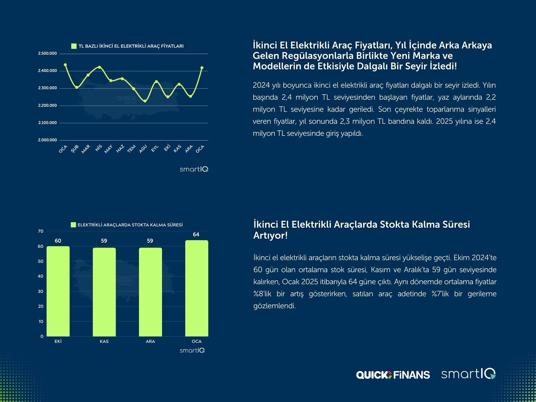 İkinci el elektrikli araçların stokta kalma süresi yükselişe geçti. Ekim 2024’te 60 gün olan ortalama stok süresi, kasım ve aralıkta 59 gün seviyesinde kalırken, Ocak 2025 itibarıyla 64 güne çıktı. Aynı dönemde ortalama fiyatlar %8’lik bir artış gösterirken, satılan araç adedinde %7’lik bir gerileme gözlemlendi.